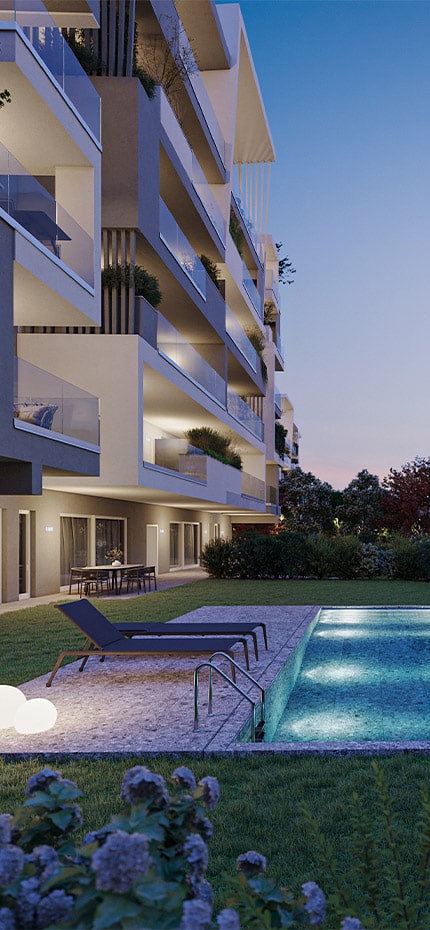 Gli appartamenti al piano terra vantano giardini privati, oasi di pace perfette per momenti di relax e convivialità all’aria aperta.